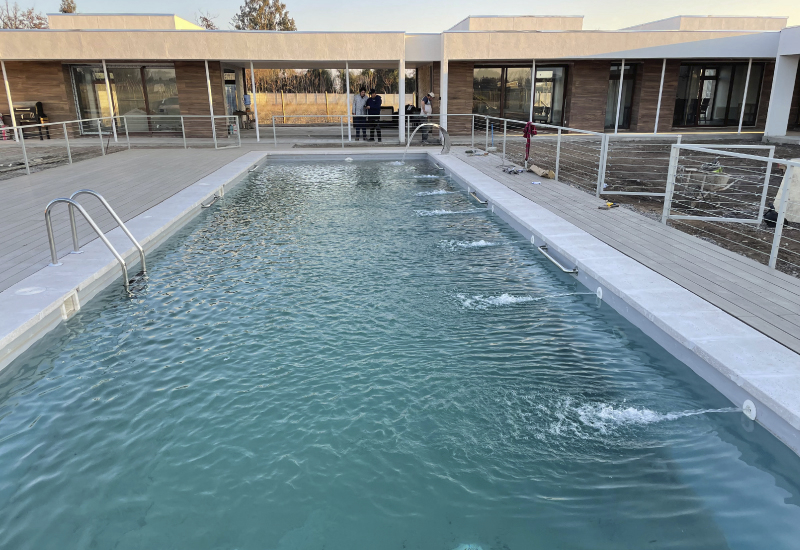 Algunas especificaciones: Piscina con revestimiento de membrana gris – Iluminación led en sus pasamanos – instalación deck de pvc en sus pasillos – sala de maquina revestida con deck – cascada acero inoxidable.